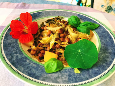 gewürfelte Zwiebeln, Kartoffeln, Spitzkohl